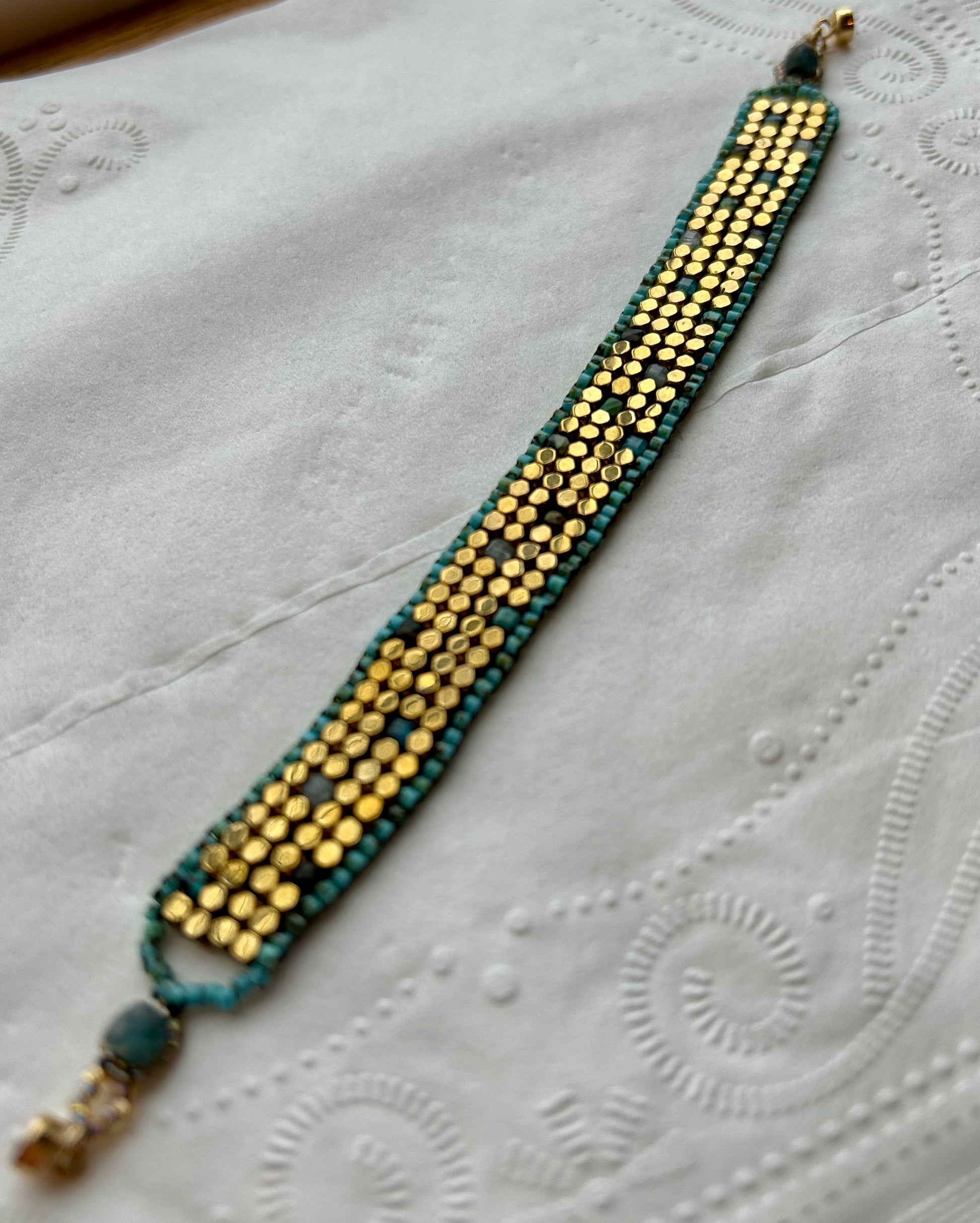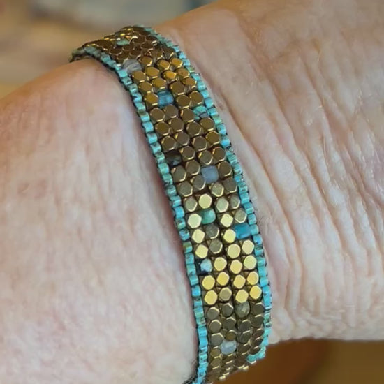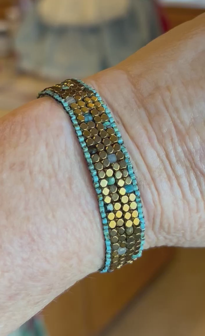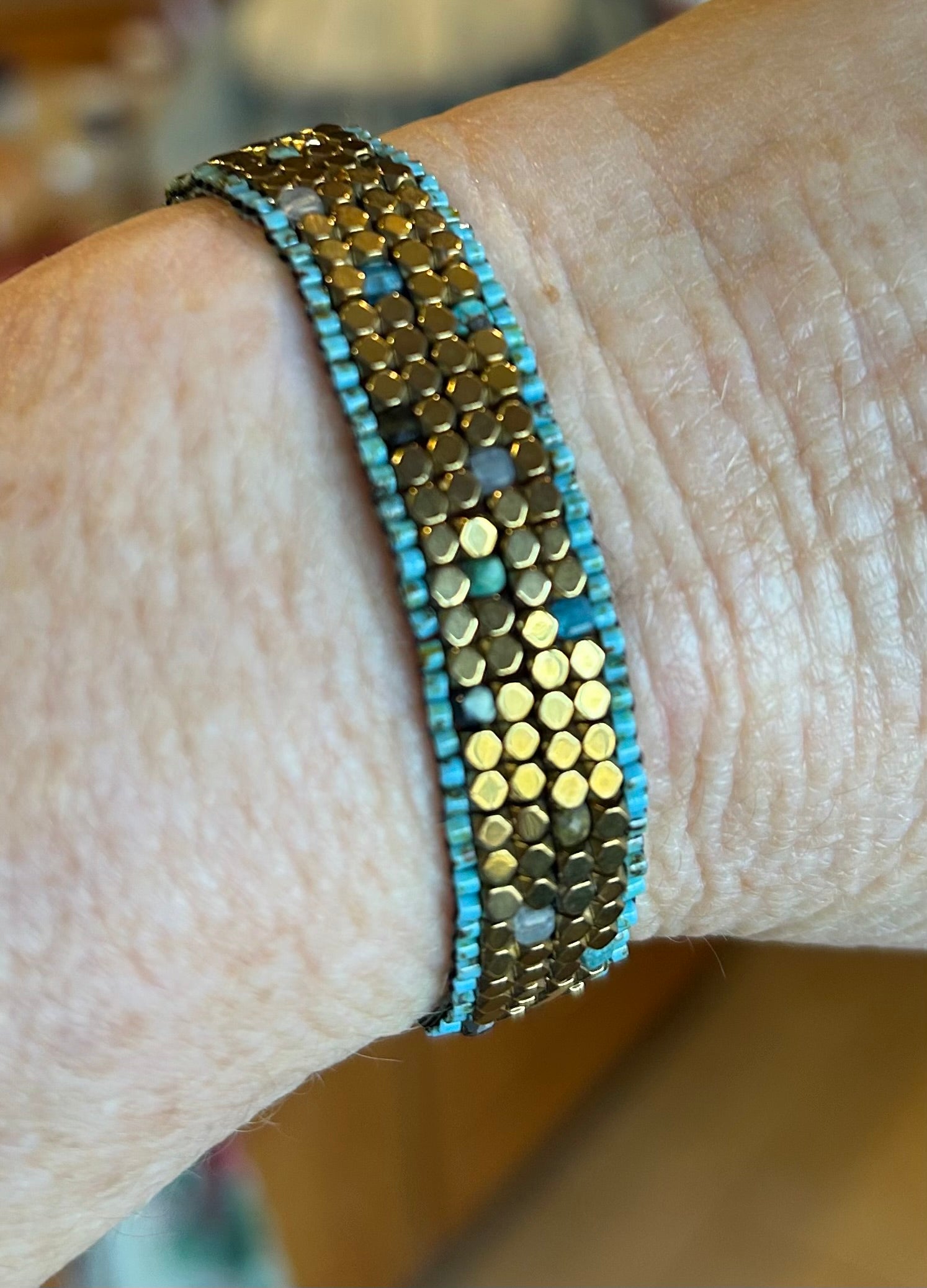 A lovely woven band of brass fired hematite beads with sumptuous faceted stone beads of blue Apatite, Turqouis, green Tourmaline and labradorite woven in.