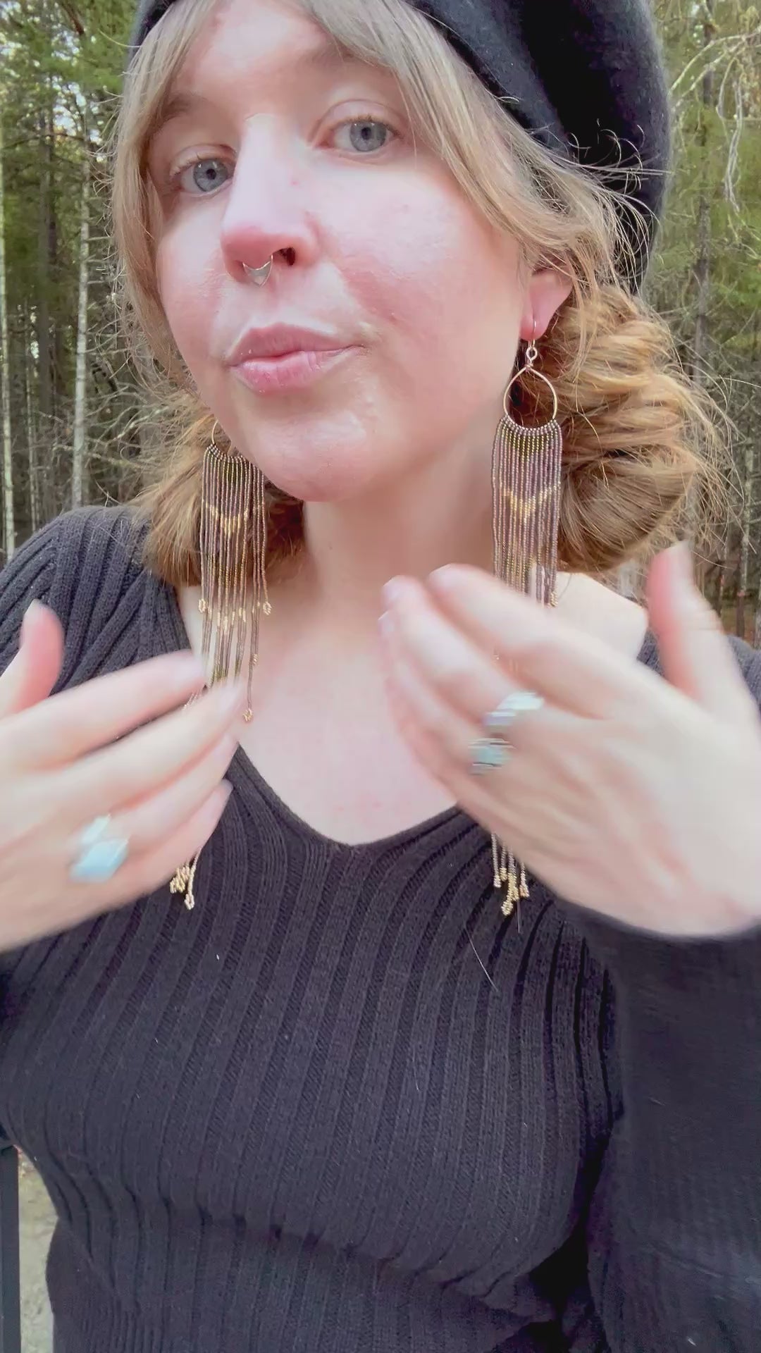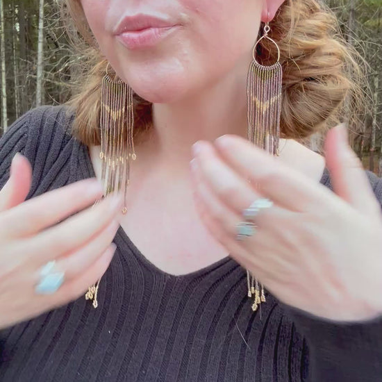 Tiny Miyuki beads woven into hand forged 14 ct. gold filled hoops.