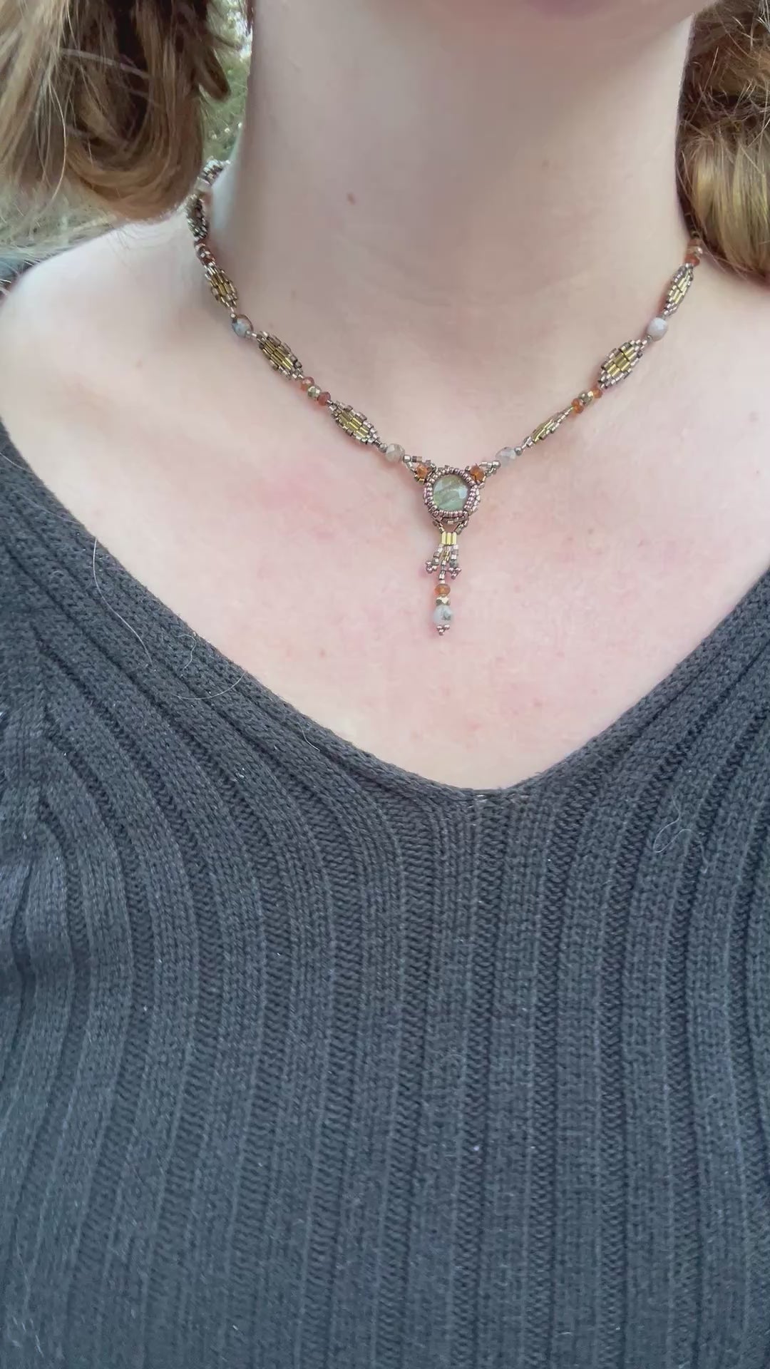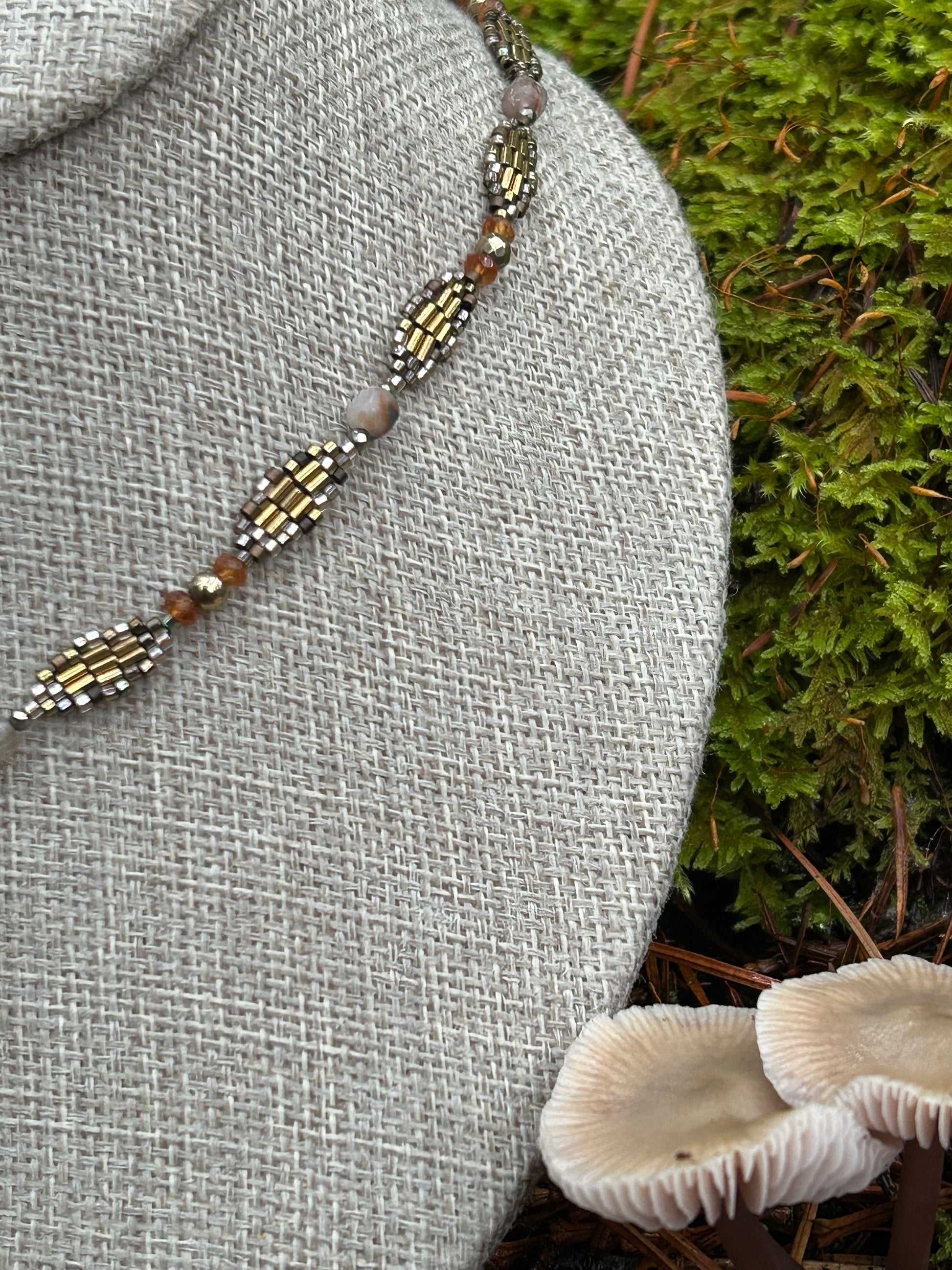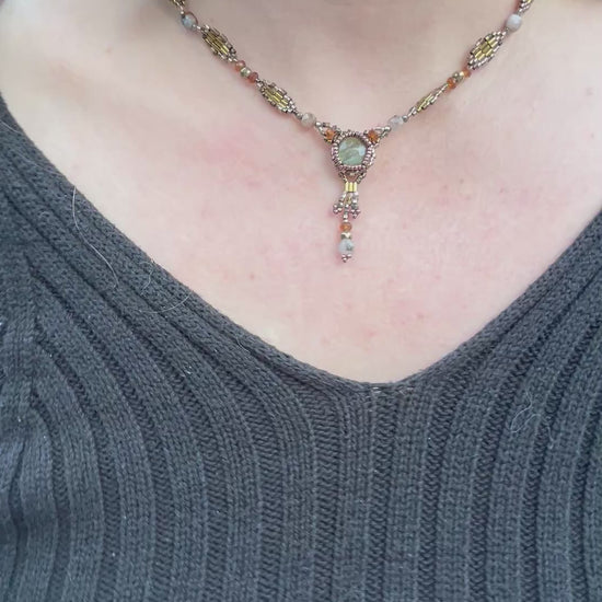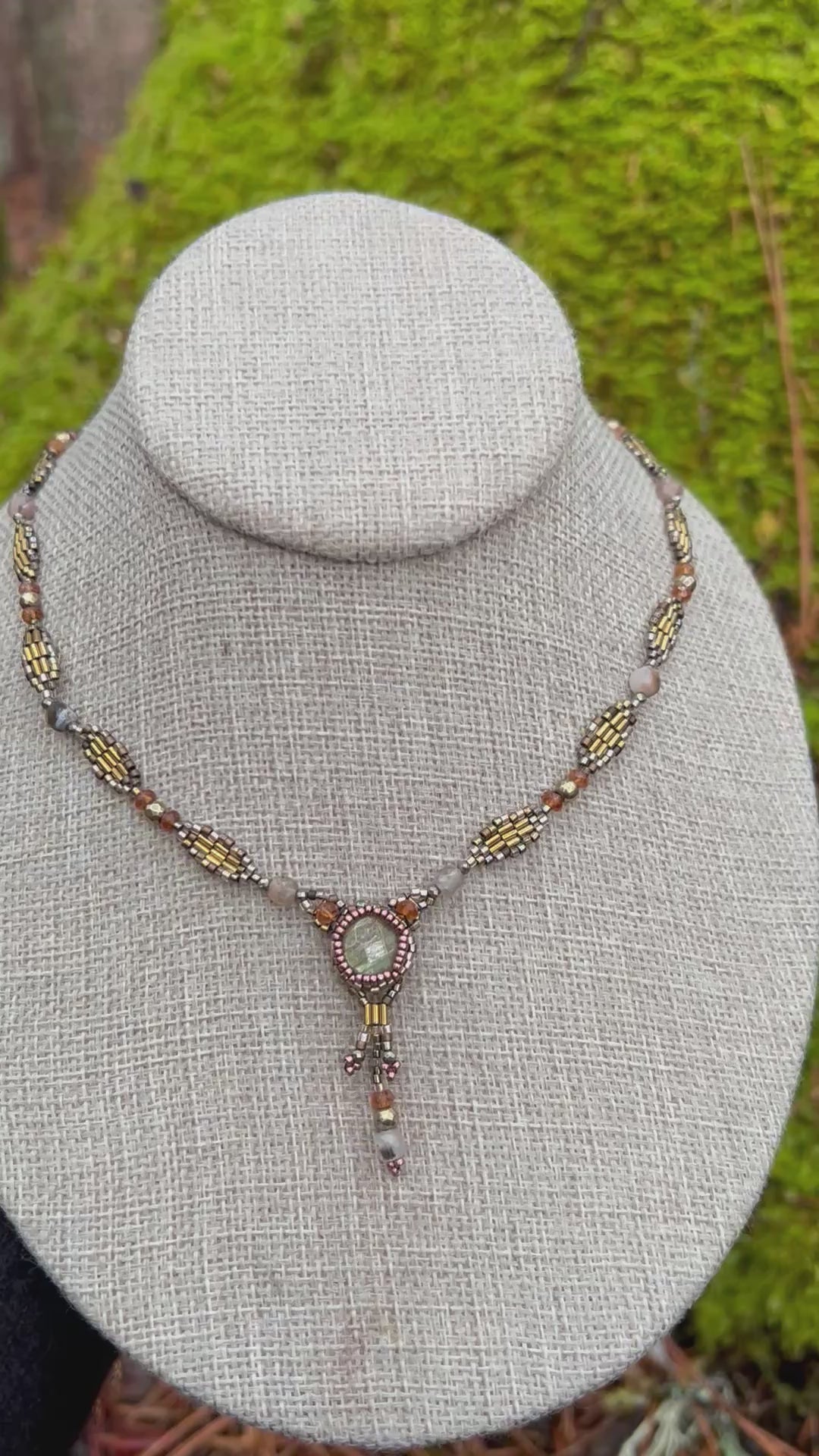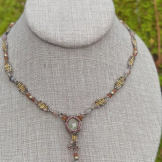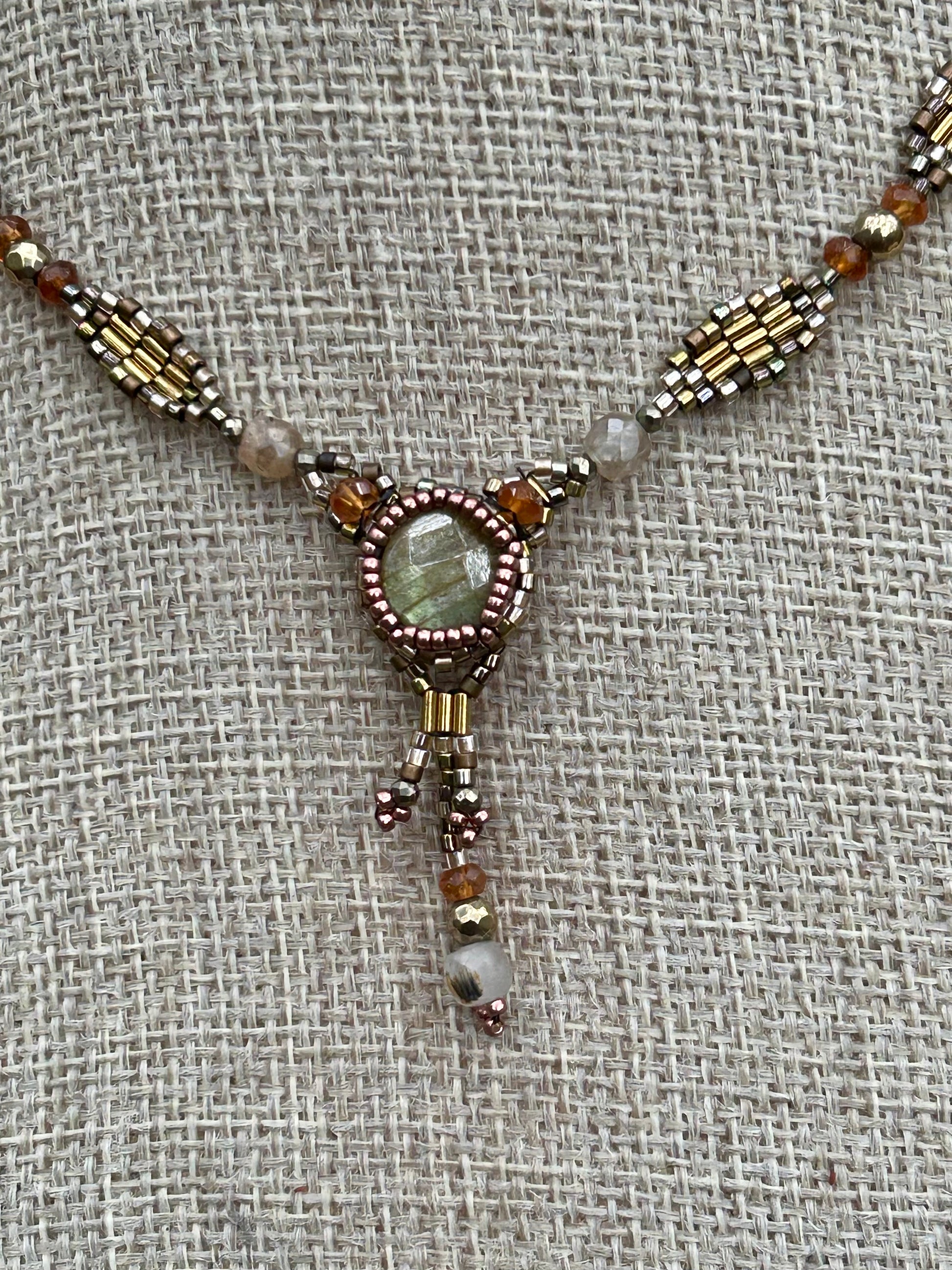Hessonite Garnet, labradorite and palazzo iron pyrite beads adorn this intricately woven seed bead necklace with a faceted labradorite centerpiece. The seed beads are size 15 Japanese Miyuki and the clasp is 14 ct. Gold-fired magnetic.