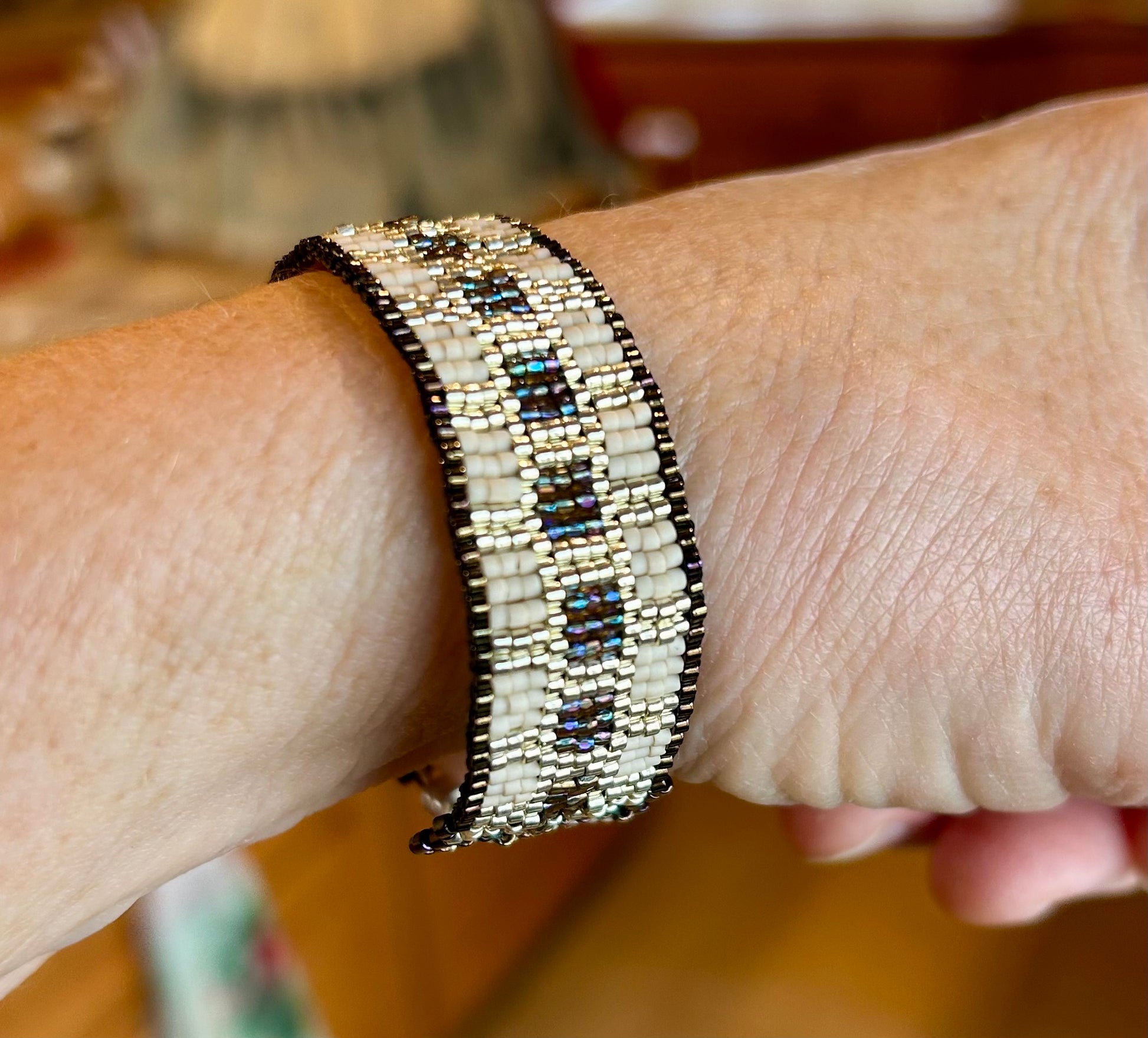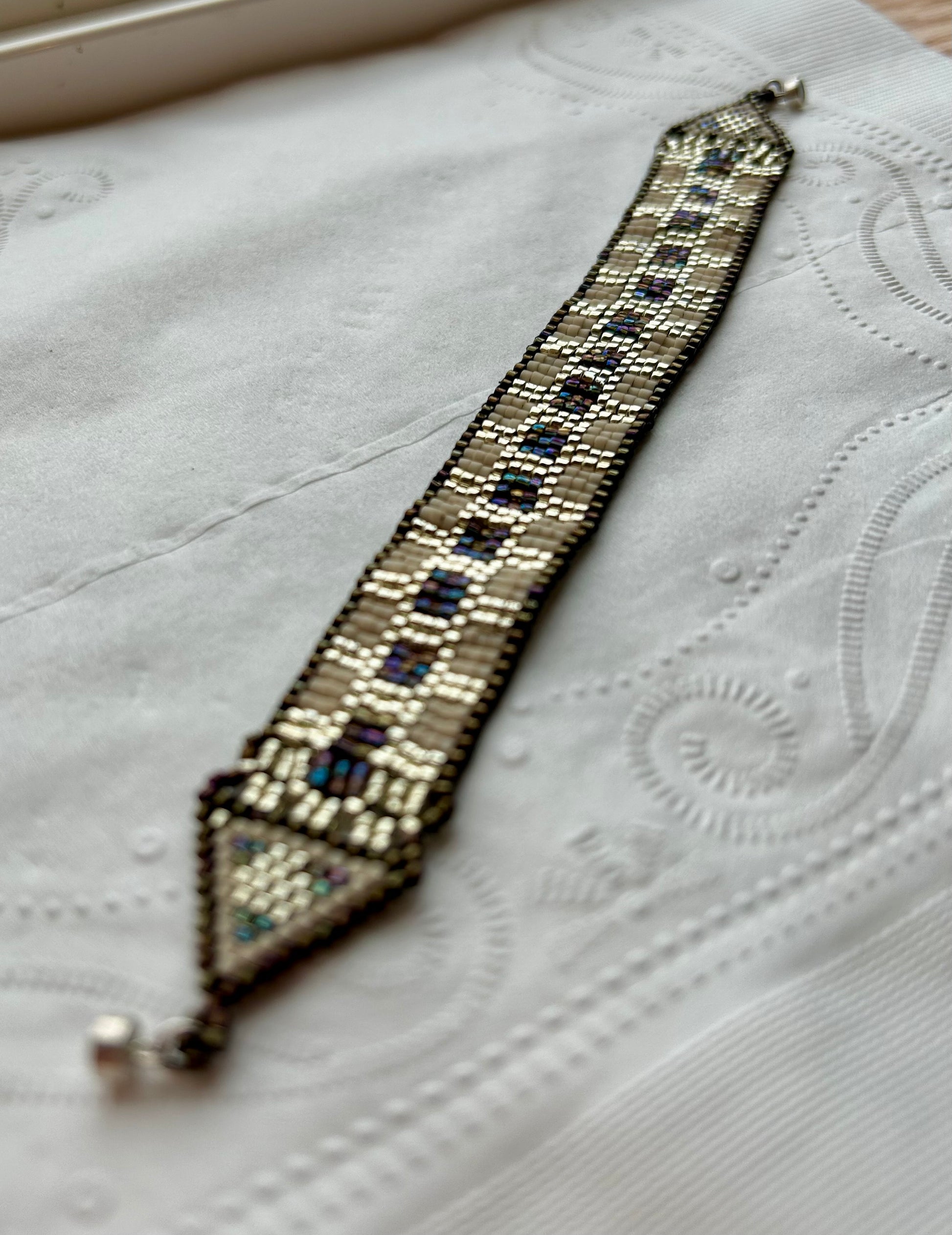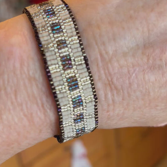 Japanese Delica beads intricately woven into an elegant band with a decidedly Egyptian flavor.
